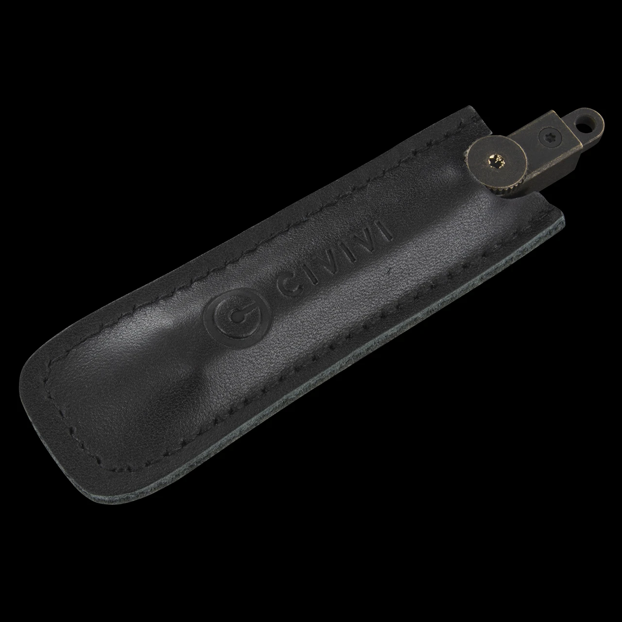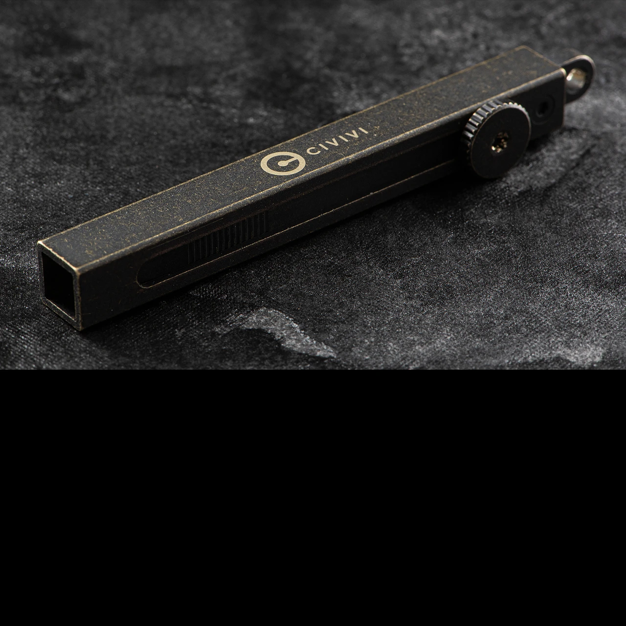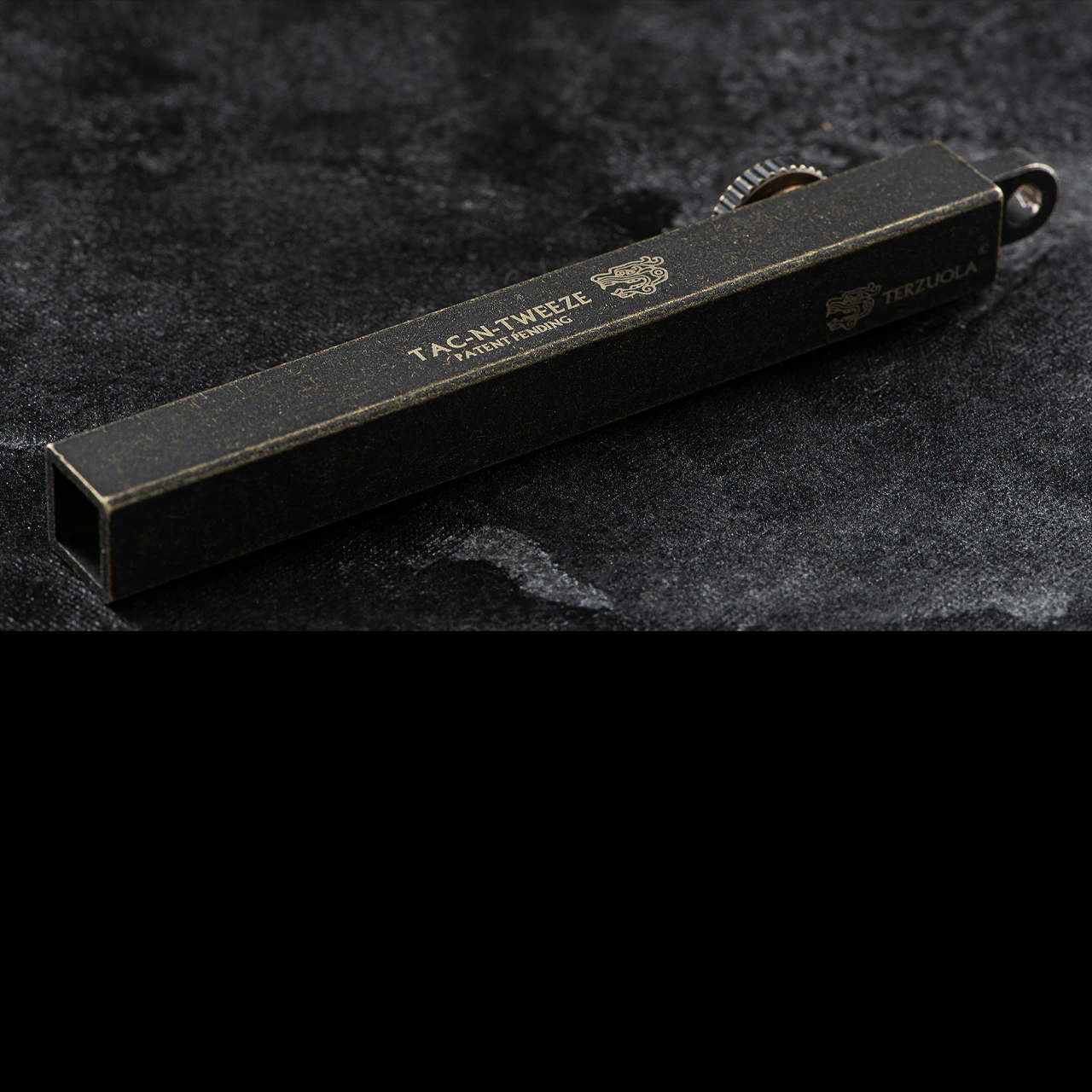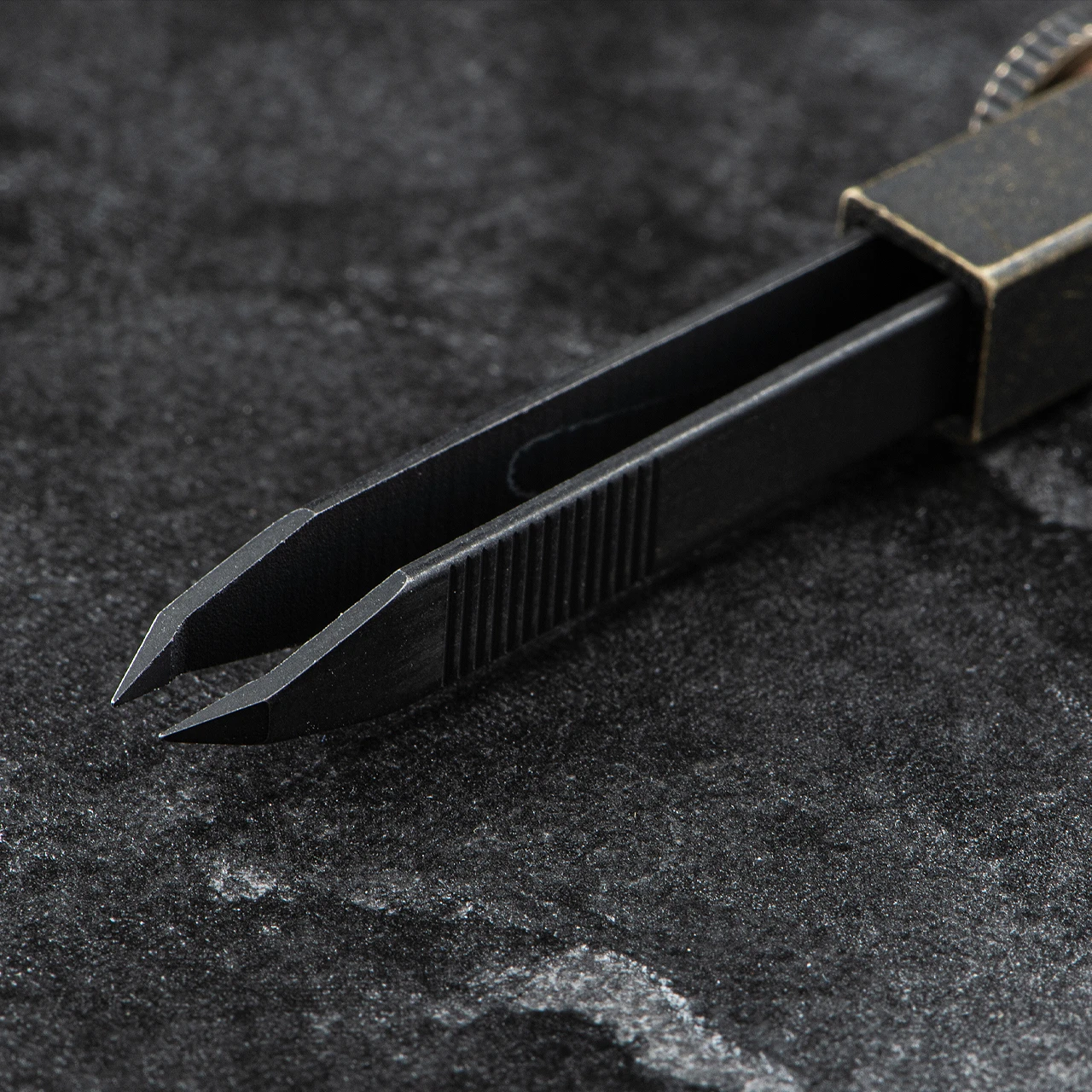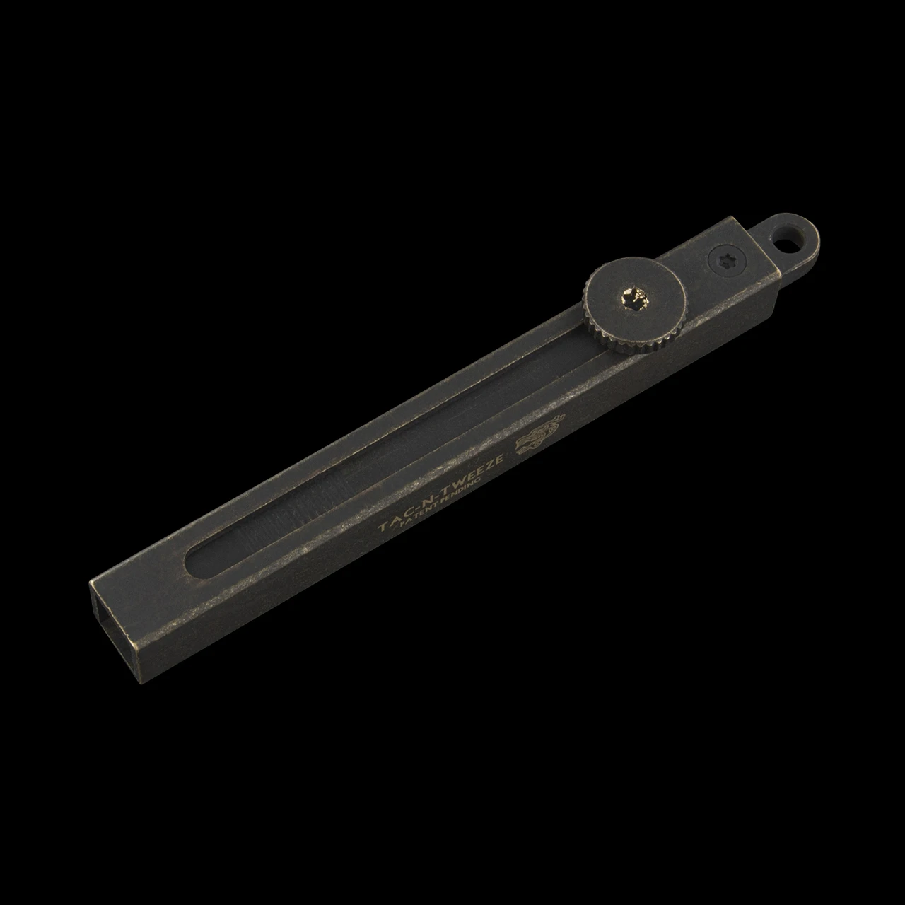 The handle is black stonewashed brass which has a strong eye appeal. Loosening the screw wheel on the side allows a precision pair of stainless, black stonewashed tweezers to slide out of the handle. They have enough point to remove the most stubborn splinters. A brass loop is attached to aid multiple carry options and a black leather pouch is also included.