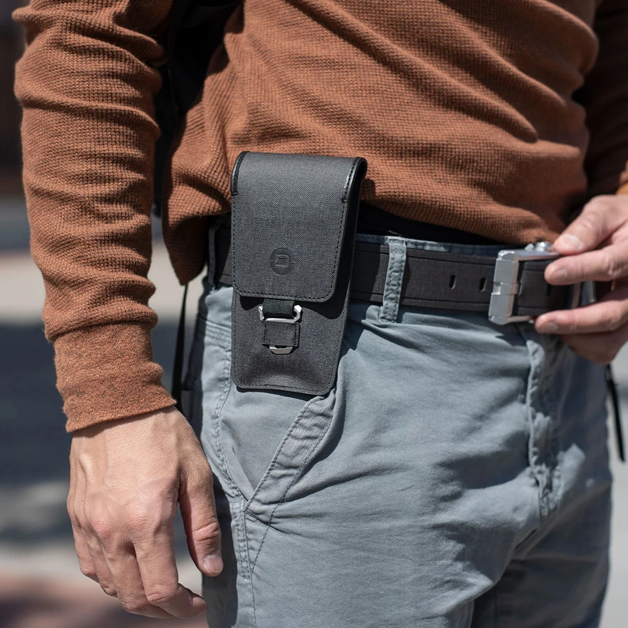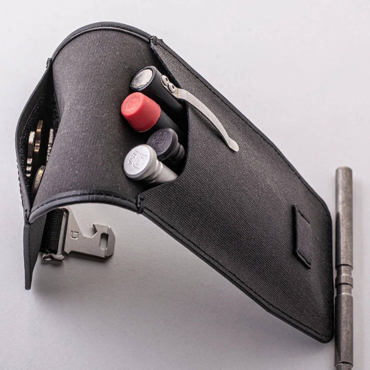 Made of water resistant DTEX material and secured by the MT01 Clasp & slot, the CA02 delivers comfort and durability. The CA02 is equipped with two inner pockets, one large pocket and one small velcro pocket for micro carry. In addition, a large through slot in the back allows the pouch to also function as a holster for belts and straps.