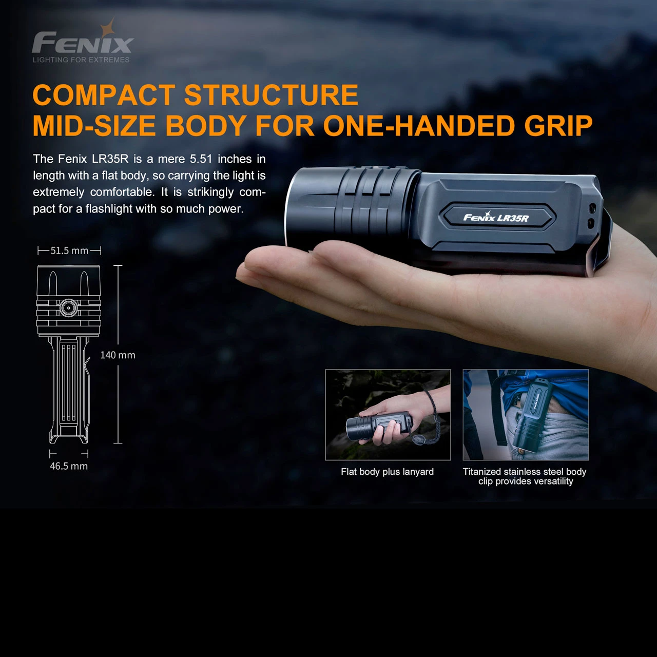 The Fenix LR35R is is a wide area ultra bright LED torch / search light with a blistering 10,000 lumen maximum output and 500m beam. At just 5.51 inches long LR35R offers superb performance for its compact, carry friendly size.