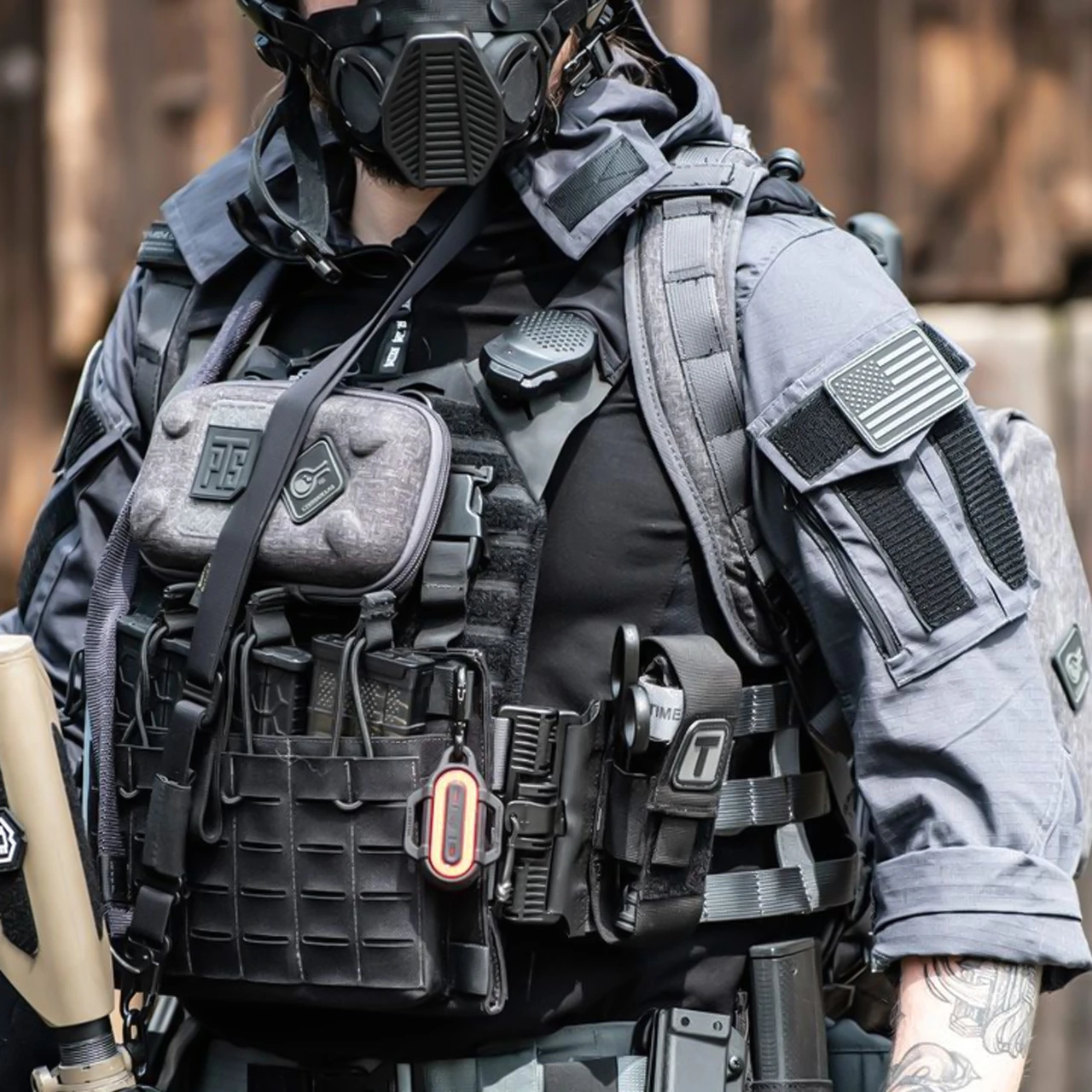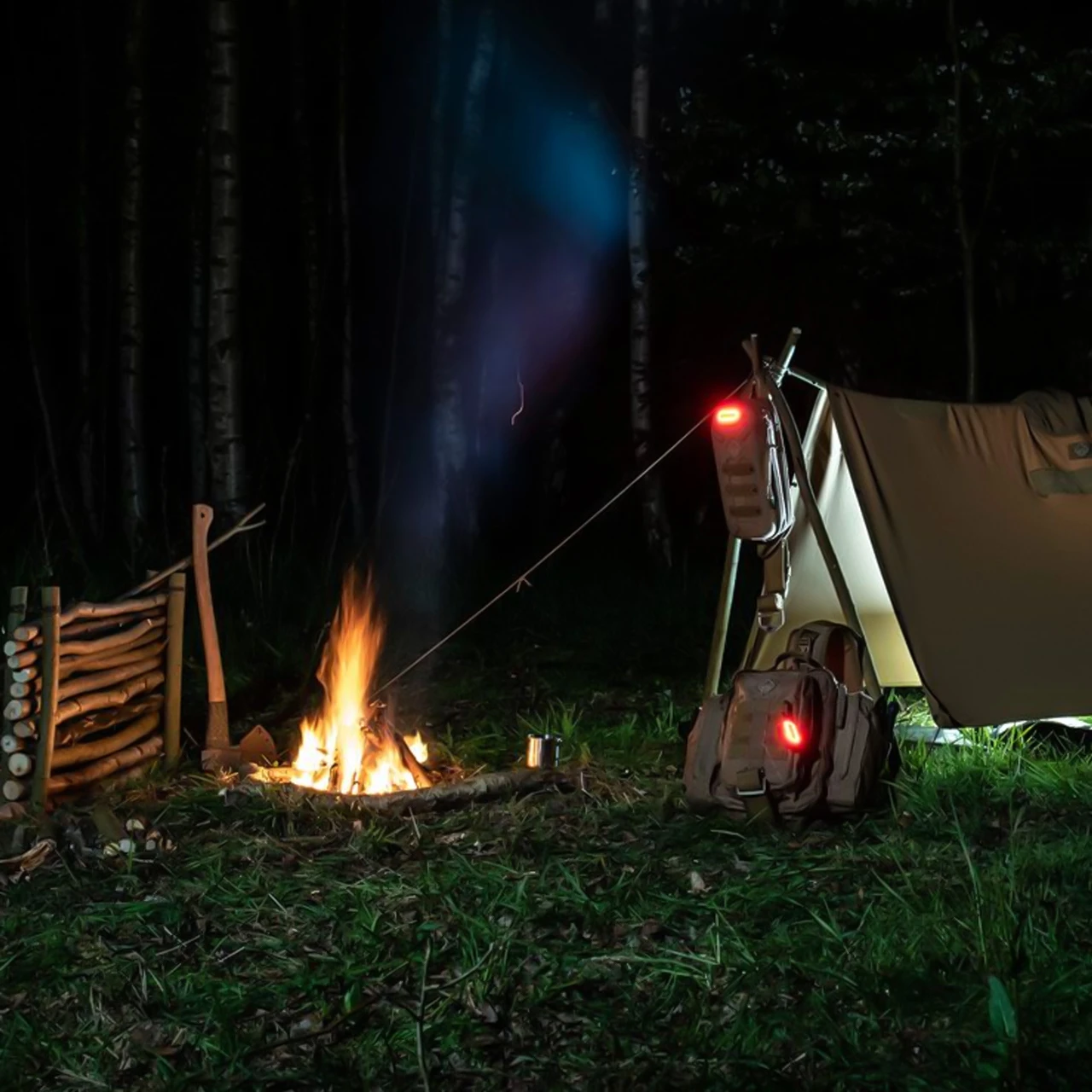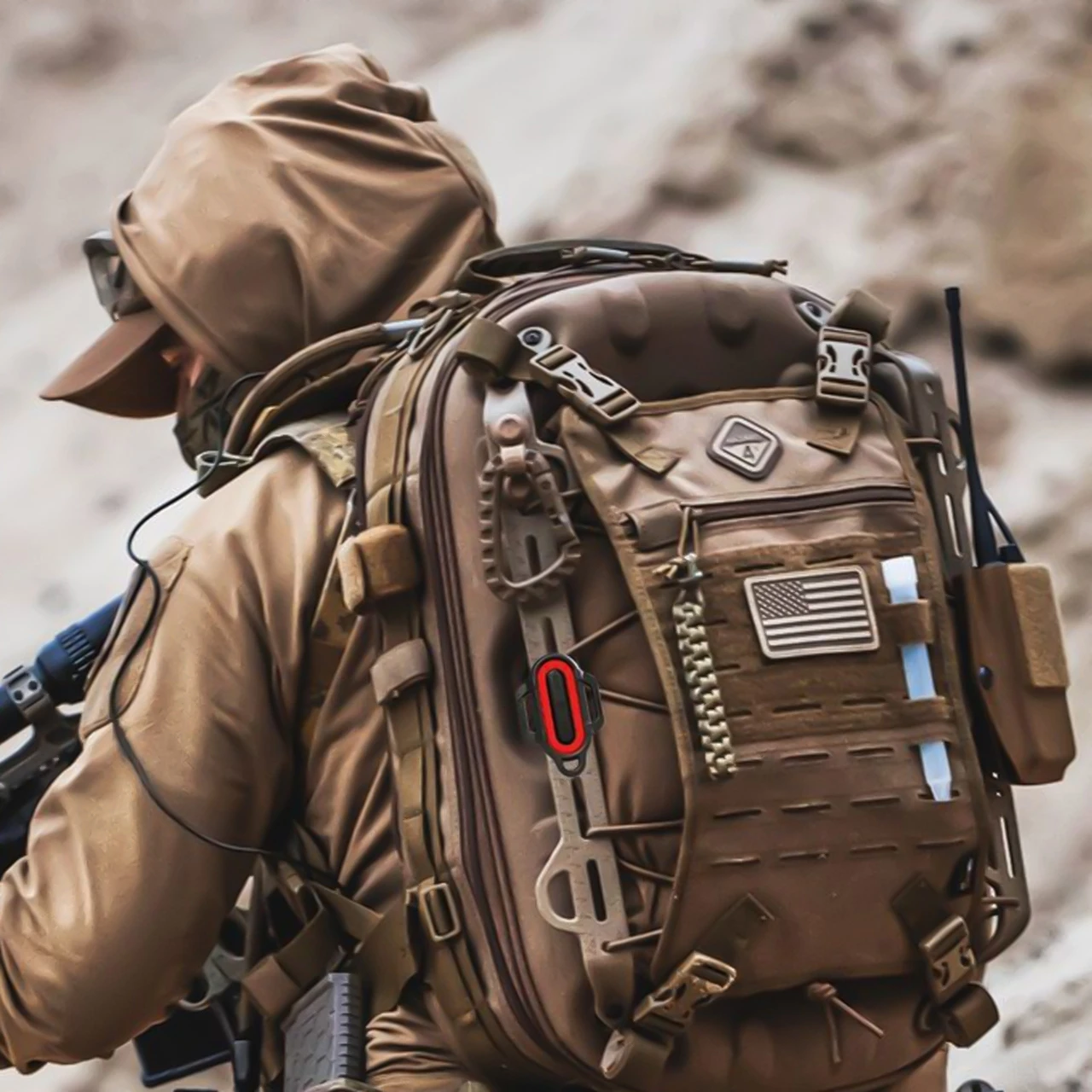 The Hazard 4 Rechargeable Beacon Light – Kit-B (red LED) screws into Hazard 4 packs/bags’ Hard Point ports via its rubber boot/hardware. Moulded loops and screw backer also allow mounting to cords, carabiners or ½” webbing. Add bright 100 Lumen visibility for bike/moto, jogging, hiking, or boating and for pro use like police, military, agency and industrial. One-button control cycles constant to 3 independent blinking/intensity modes. Constant mode is usable for reading maps, etc. (red light good for eyes’ night vision.) If mounted facing to packs/bags interiors, these are a unique illumination of bag contents. Spun in the air on any cord as illustrated, these create a large, bright circular signal; a great option for rescue or rallying purposes. The side loops keep the light oriented to the observer without twisting away on the cord.
