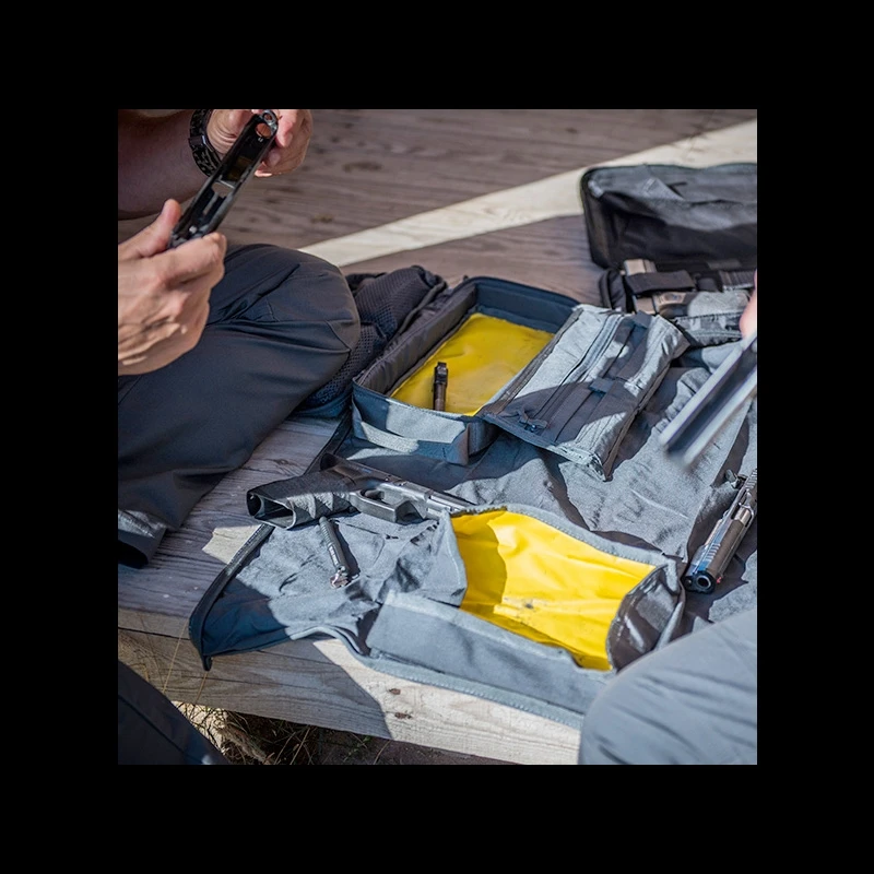 There is also a large separate “cleaning” mat on which you can lay out gun parts or knives ready for repair or cleaning, plus there is a waterproof robust “dish” for dipping parts in cleaning liquids and spraying them with cleaning compounds.