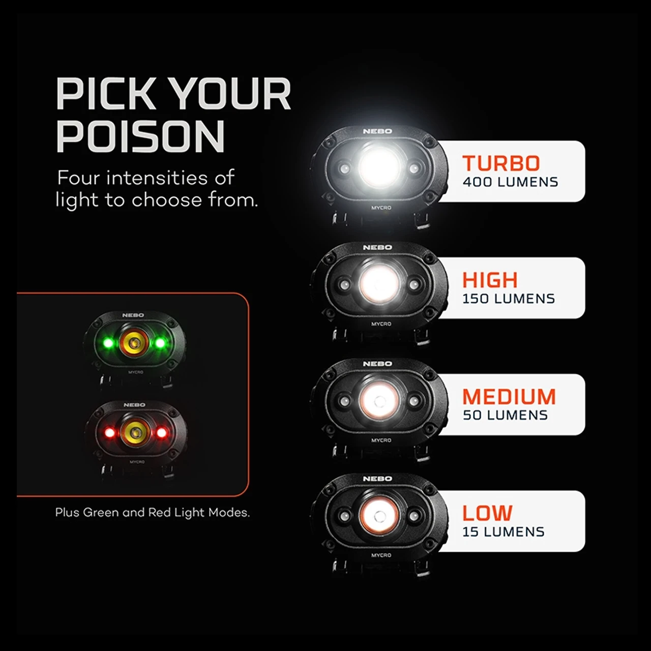 Light modes include high (150 lumens), medium (50 lumens), and low (15 lumens), as well as red and green. The turbo mode gives a 400 lumen blast for up to 30 seconds for maximum brightness.