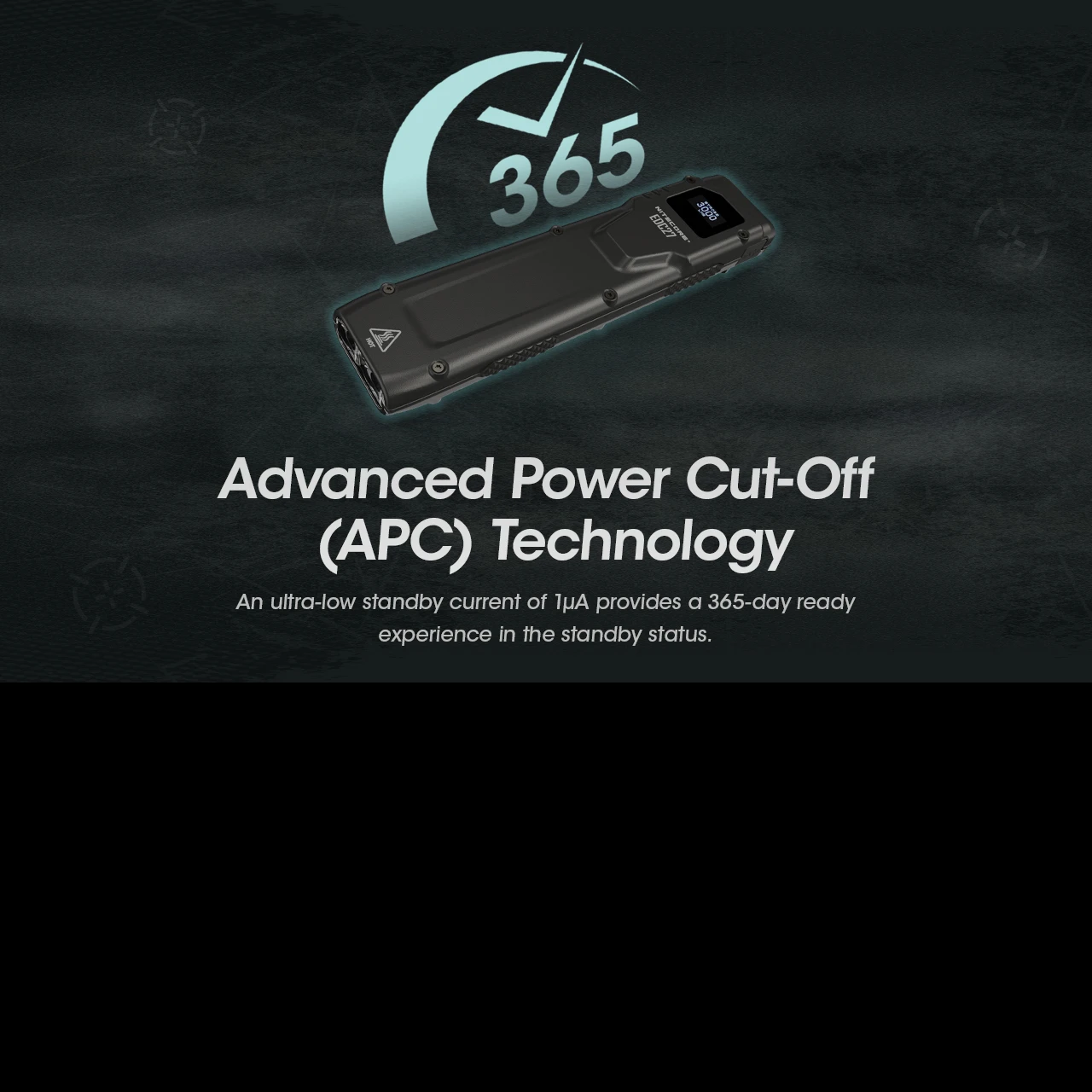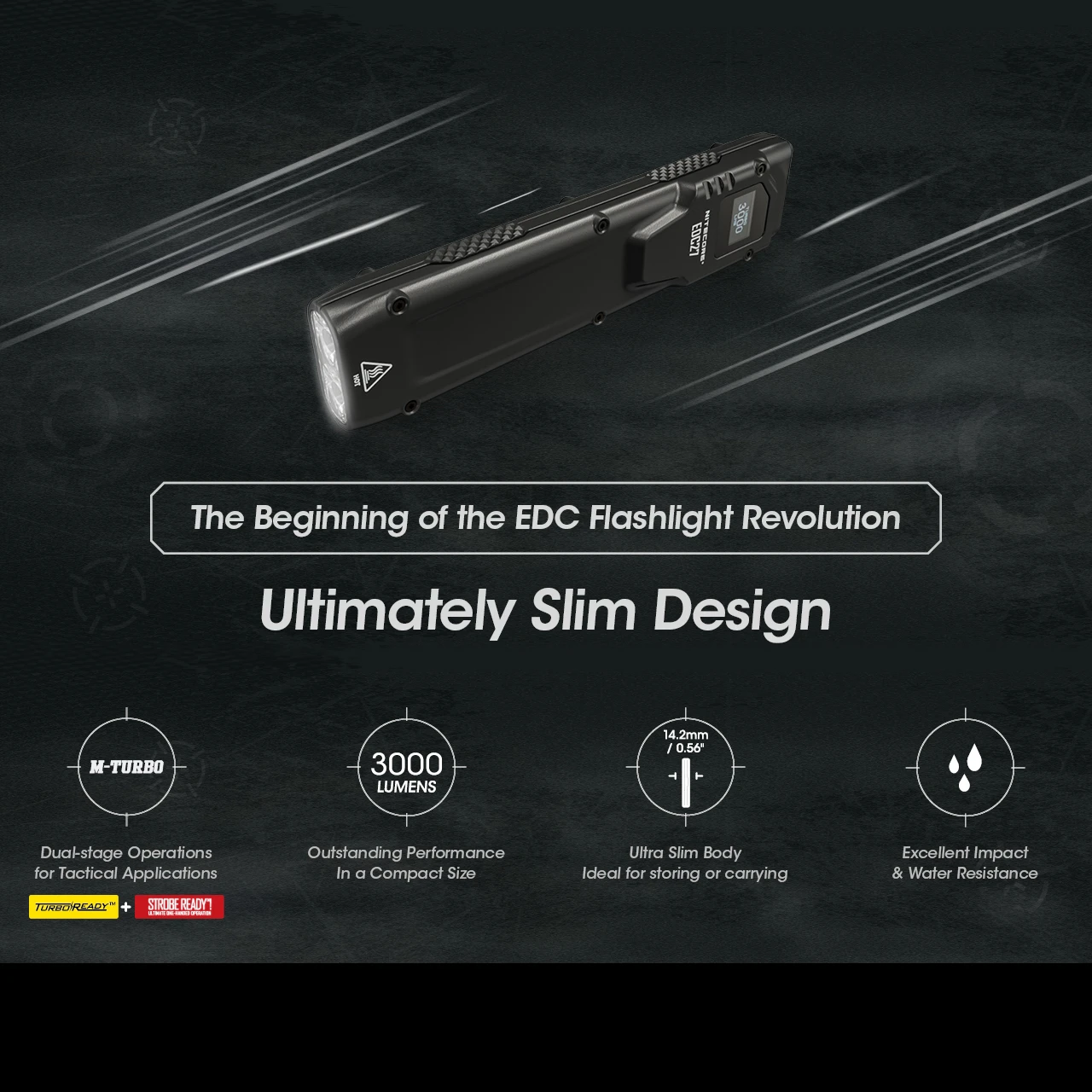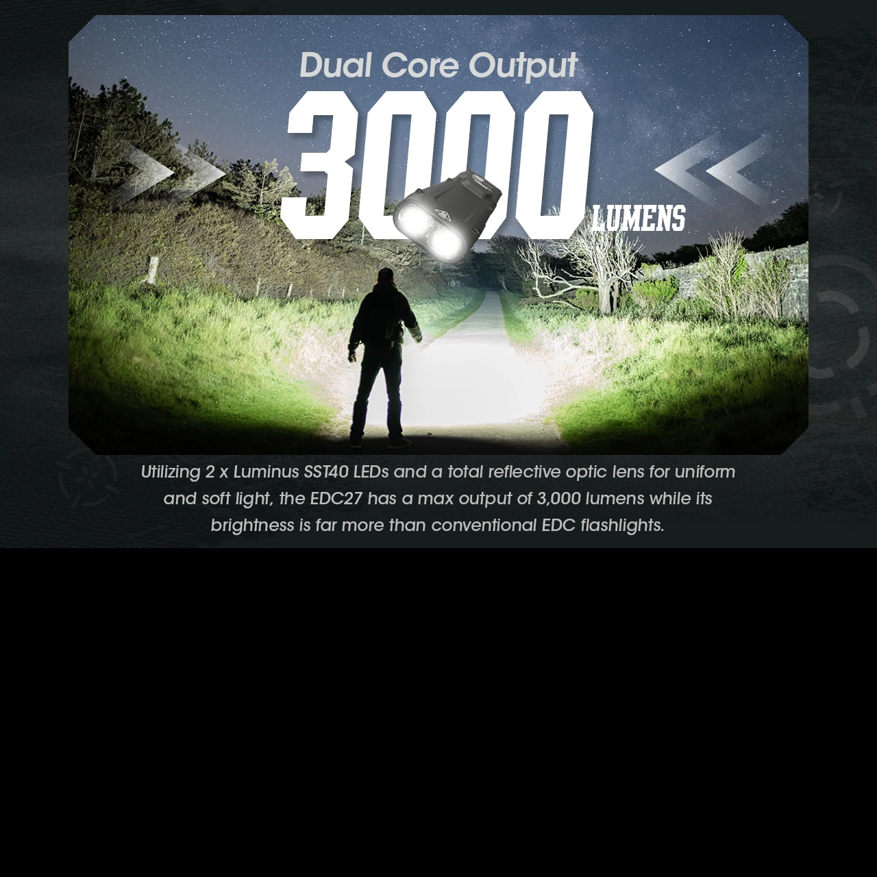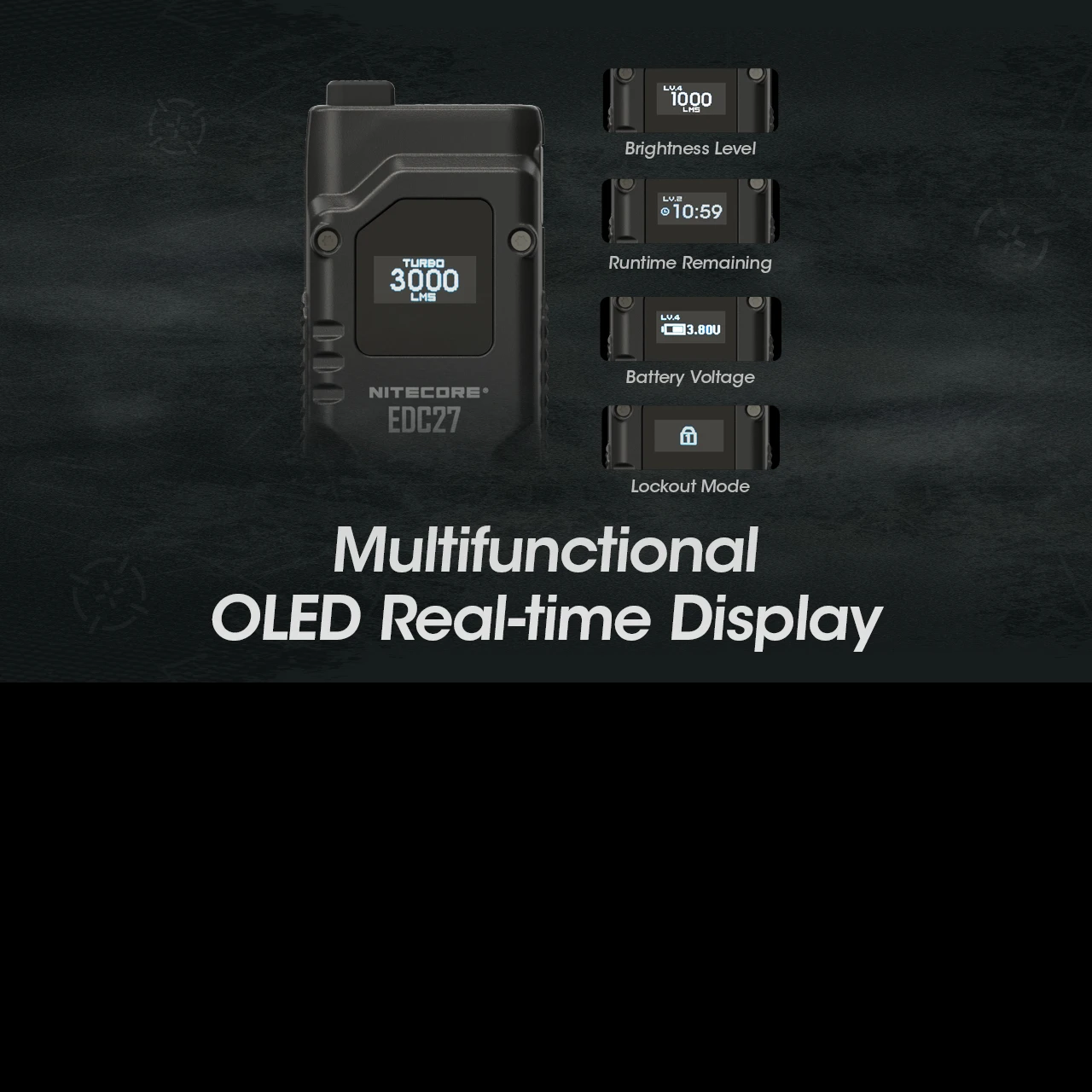 The EDC27 features a multi-functional OLED display screen which provides real-time information on brightness levels, remaining runtime, battery voltage and lockout mode. To prevent accidental activation, the torch has a half and full lockout mode which display as either 1 or 2 respectively, on the screen.