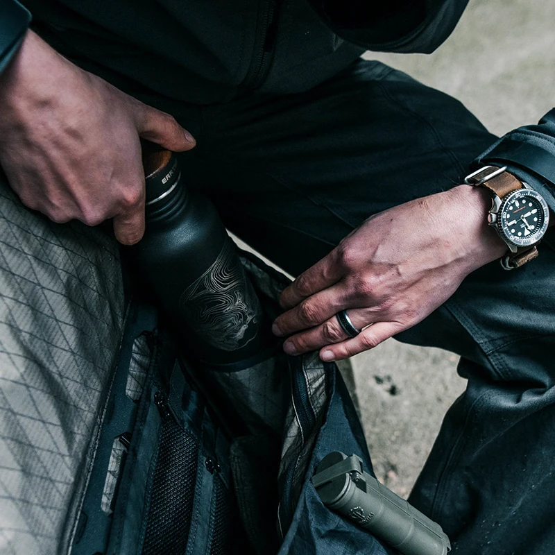 The Earthwell 27oz TAD Edition in sand is a single walled flask, perfect as an everyday companion for cold beverages. The TAD edition features a custom laser etched graphic revealing the stainless steel below, dramatically contrasting against the durable matte tactile finish. The stainless steel cap features a distinctive wood overlay in either walnut or maple on black or sand finishes respectively. A steel D ring in the cap makes carry or lashing to gear easy.