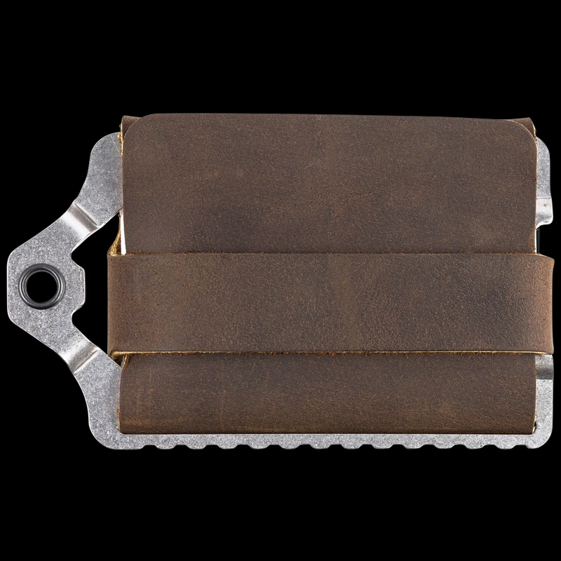 The Trayvax Element is an all-American classic take on the classic leather wallet. This beauty oozes quality. From the chunky 2.5mm stainless steel plate which forms the backbone of this wallet, to the top-grain, oil-tanned leather which encloses your cards, you’ll know that you own something special. The leather is secured to the steel with a length of MIL-SPEC paracord, very well finished off. It’s supplied with instructions on how to mould the leather to the shape of the cards in your EDC. It’ll comfortably carry between one and five bank cards and up to five bank notes held in place on the internal money clip. Of course, no American classic would be complete without a bottle opener, and there’s one built in to the structure of the backbone of this wallet.