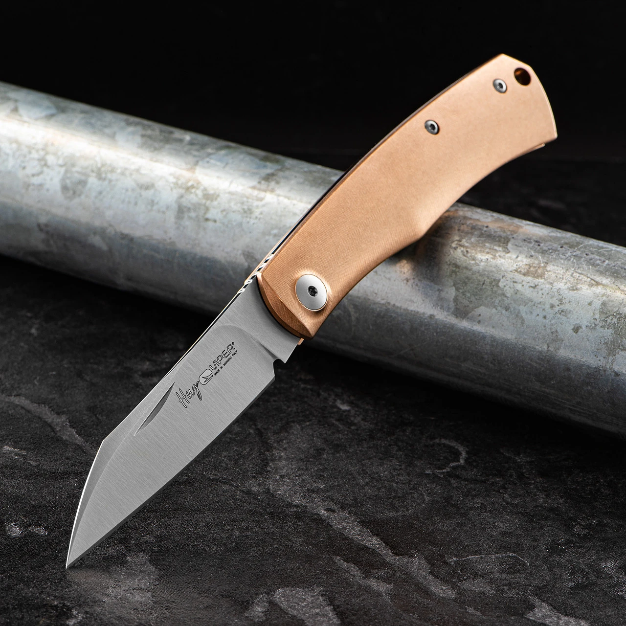 The Hug is a compact folding knife with a peaceful temperament, designed to go with its owner every day, always ready to offer extraordinary cutting qualities thanks to its ultra sharp Böhler M390 blade which is elegantly satin-finished. This is a very special folder with a heavyweight bronze handle.